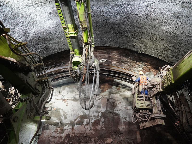 LH-150Y掘進(jìn)支護(hù)一體機(jī)組是藍(lán)海智能針對隧道掌子面施工開發(fā)集掘進(jìn)開挖、支護(hù)、噴漿、打錨桿作業(yè)等功能于一體的集成化施工,實(shí)現(xiàn)掌子面全工序作業(yè)設(shè)備。具備非爆掘進(jìn)、鉆爆掘進(jìn)、出渣、立架、打鎖腳和錨桿、注漿、噴漿等進(jìn)行平行作業(yè)能力,能滿足鐵路單洞雙線隧道、高速隧道、市政隧道、鐵路小斷面隧道施工作業(yè),一次掘進(jìn)隧道斷面尺寸寬度14-16米,掘進(jìn)高度7.8米以上,相比現(xiàn)在采用單工序循環(huán)作業(yè)方式,每班提升效率50%~60%。